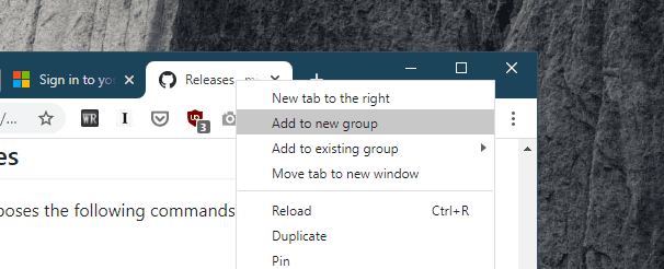 Haga clic con el botón derecho en una pestaña que desee agrupar y elija Agregar a nuevo grupo o Agregar a grupo existente, si corresponde.