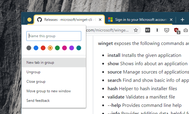 Una vez que haya configurado los grupos, puede darle un nombre, asignar un color para distinguirlos de otros grupos, desagruparlos o mover todo el grupo de pestañas a una nueva ventana.