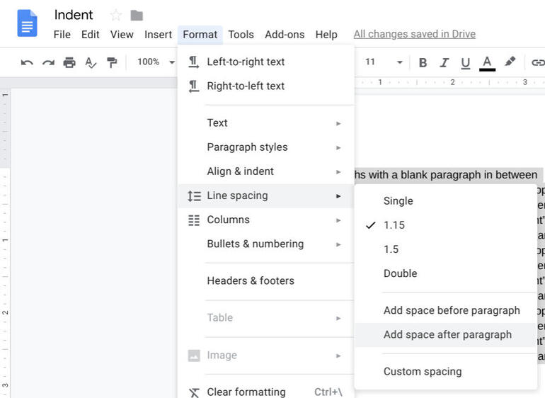 Una forma alternativa de agregar separación visual entre párrafos es ajustar una configuración de Google Docs para agregar espacio.
