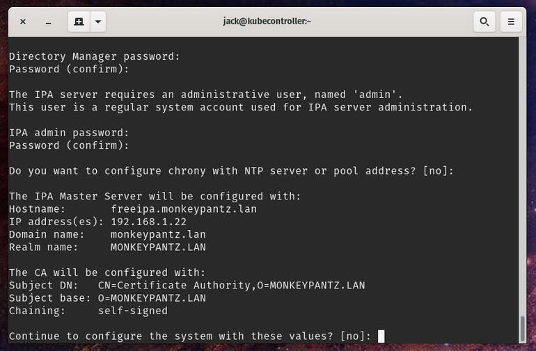 La primera pregunta que debe responder es si desea o no instalar BIND para DNS. Acepte el valor predeterminado (no) presionando Enter en su teclado. Luego debe confirmar el dominio y el nombre de reino, que serán detectados por el script. Una vez que haya confirmado esas entradas, deberá establecer una contraseña de administrador de directorio, una contraseña de administrador de IPA para la interfaz web y luego aceptar la predeterminada (no) para la instalación de chrony.