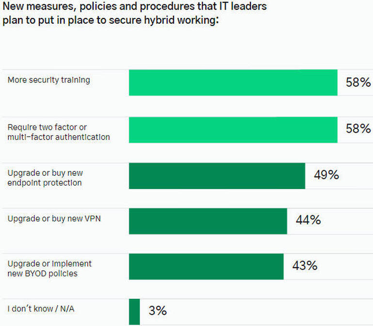 • Modifique sus políticas de BYOD (Traiga su propio dispositivo). Alrededor del 43% de los líderes de TI dijeron que ahora tienen como objetivo actualizar sus políticas BYOD para proteger mejor su organización para el trabajo híbrido.