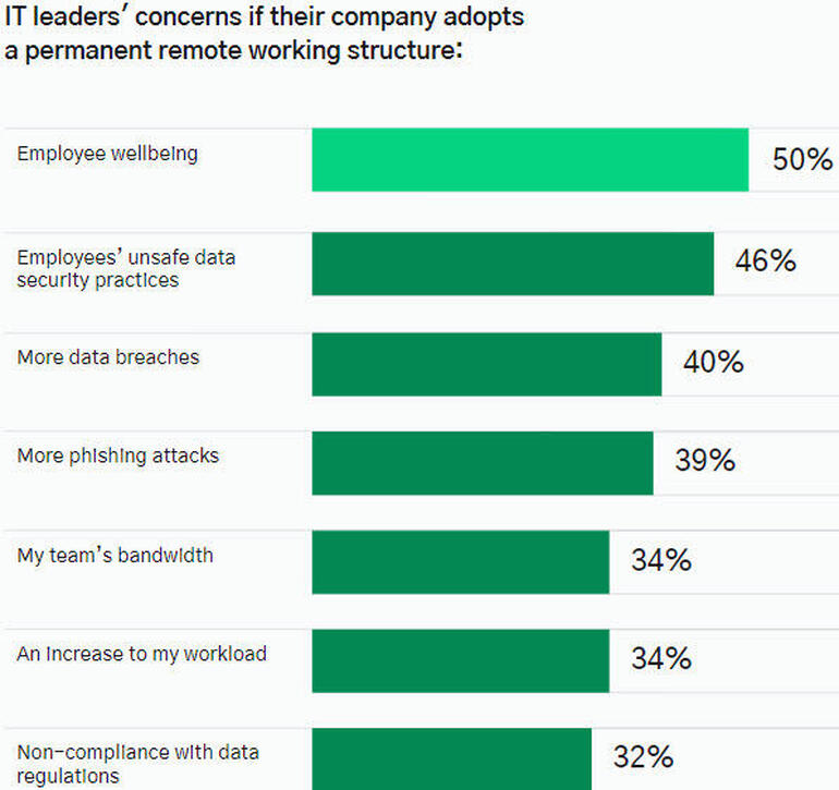 A medida que las organizaciones adoptan una configuración de trabajo remota o híbrida, los líderes de TI están nerviosos por otros factores, incluido el bienestar de los empleados, el uso de prácticas de seguridad de datos inseguras, más violaciones de datos y ataques de phishing, y una mayor carga de trabajo para ellos y el grupo de TI.