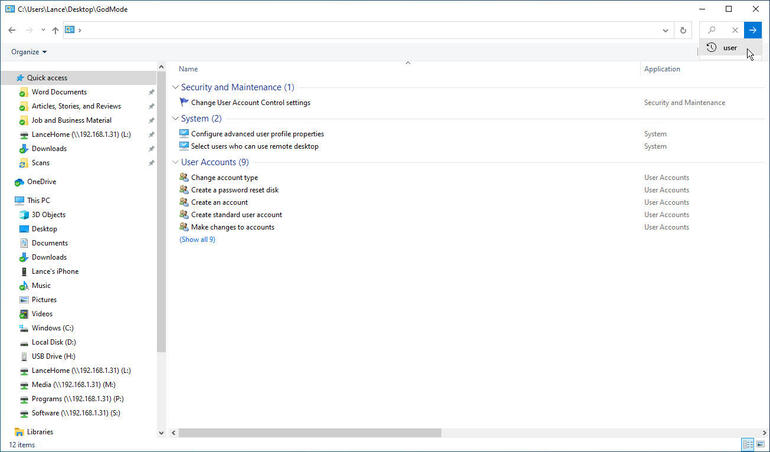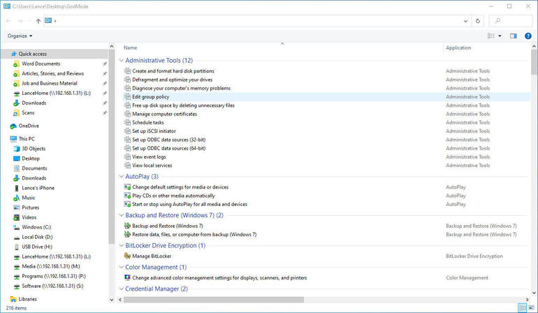 Haga doble clic en el icono y se abrirá una ventana con todos los comandos accesibles. Tenga en cuenta que los comandos están organizados por subprograma del Panel de control para que pueda navegar a través de las diversas categorías, incluidas Herramientas administrativas, Gestión del color, Dispositivos e impresoras, Historial de archivos, Opciones de Internet, Programas y funciones, Seguridad y mantenimiento, Solución de problemas y Cuentas de usuario (Figura C).