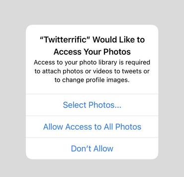 Para usar el nuevo selector de fotos limitado, siempre que aparezca el cuadro de diálogo de acceso como el anterior, elija la opción Seleccionar fotos y luego siga estos pasos.