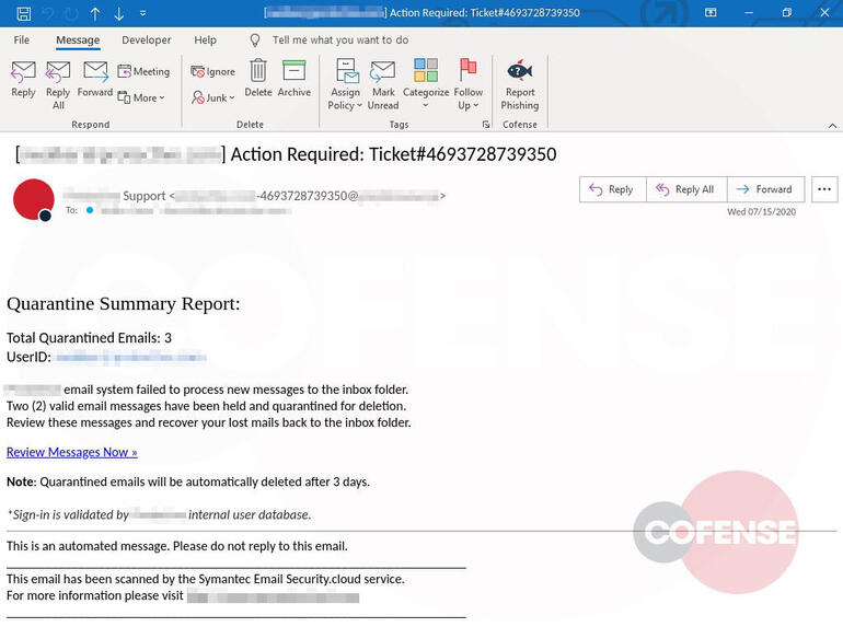 La campaña parece convincente en una variedad de formas, según Cofense. Al falsificar la cuenta del personal de soporte interno, el correo electrónico de phishing parece provenir de una fuente confiable. El aviso de cuarentena suena real, incluso afirma que los mensajes en cuarentena no se procesaron y deben revisarse para confirmar su validez.