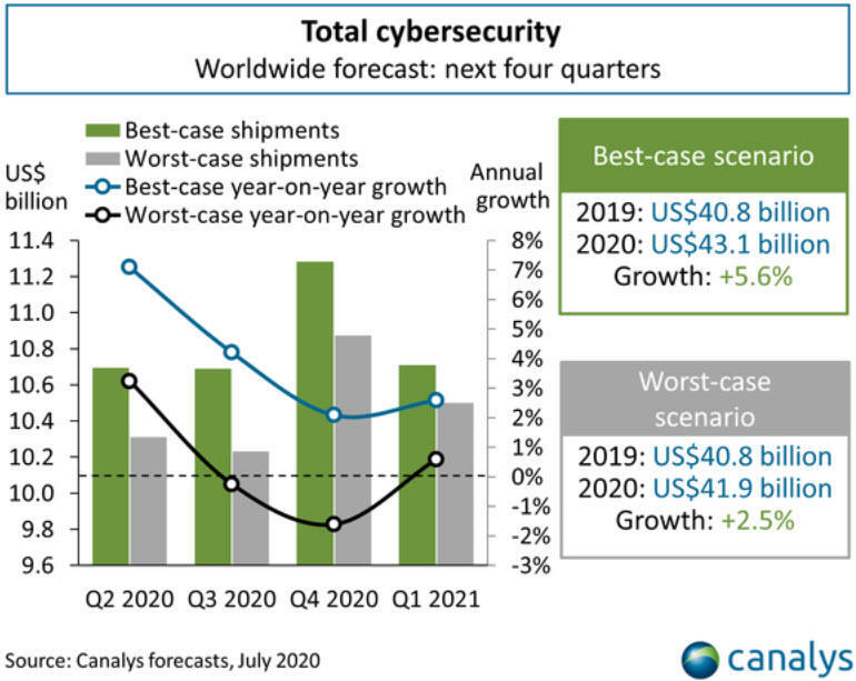 En el mejor de los casos, Canalys espera que el gasto mundial en ciberseguridad crezca un 5,6% este año, alcanzando los $ 43,1 mil millones. En este caso, las inversiones en seguridad seguirán superando a la economía con aumentos en el gasto en seguridad de terminales, seguridad de red, seguridad web y de correo electrónico, seguridad de datos y análisis de vulnerabilidad y seguridad.