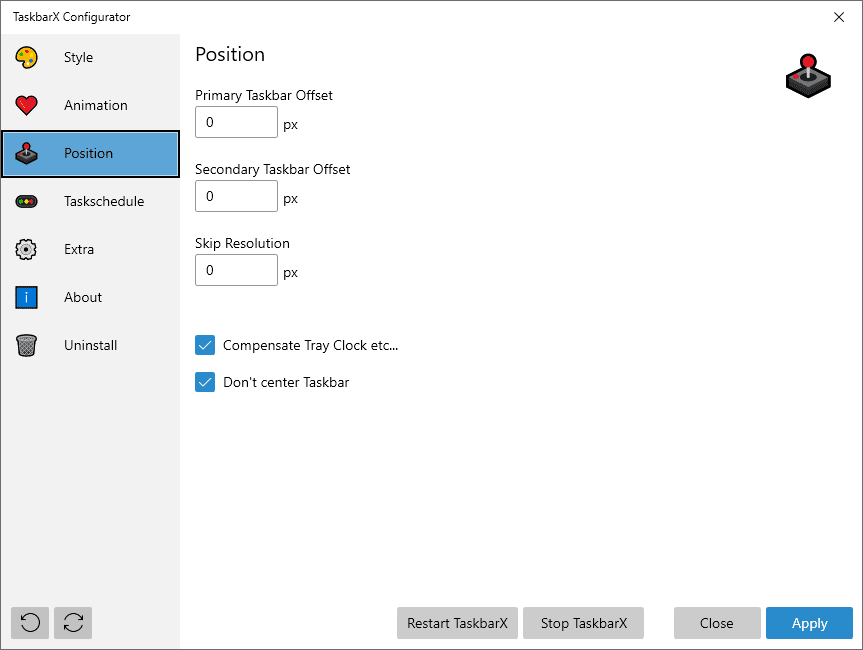 Si desea centrar los botones de la barra de tareas, diríjase a la pestaña Posición.