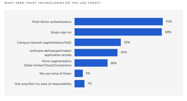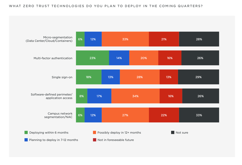 Después de los próximos seis meses, la mayoría de los encuestados dijeron que implementarán la microsegmentación y SDP para allanar el camino para la adopción de confianza cero a escala y el 51% dijo que implementarán la microsegmentación como un control primario de confianza cero, citando su eficacia e importancia en la prevención de alto perfil. rompe ya que detiene el movimiento lateral.